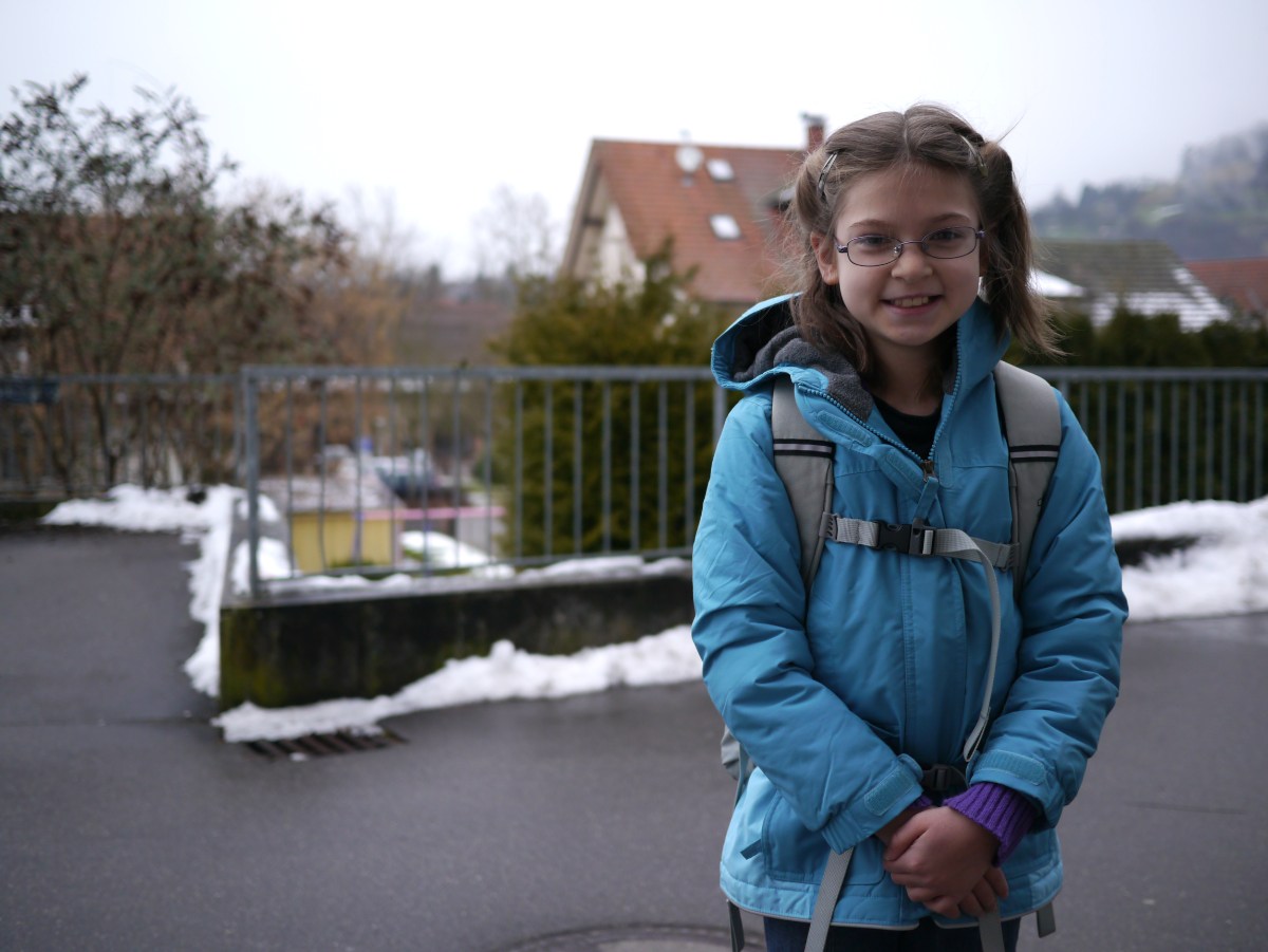 Every school day around 8:30 in the morning, she and I (and now Will) walk the two minutes down our street, across one of the main streets in town, and into the Blumenplatz where a large city bus picks up the elementary students. Once she gets on the bus, I'm afraid I don't know much about her day other than the schedule I have from the teacher. Just before 4 each day we traipse back down to the bus stop in all kinds of weather (yesterday it was snowing quite hard), to meet the returning bus.
