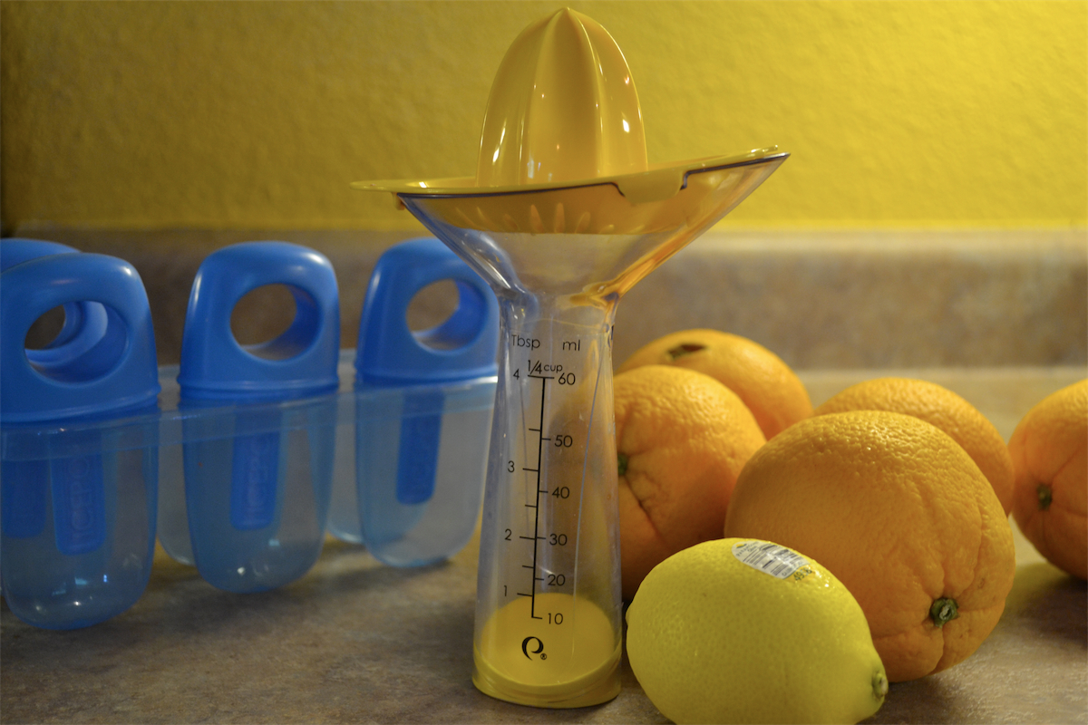 Once the boys were in bed for naptime, Elise and I spent a few minutes squeezing oranges and lemon and blending it with leftover pineapple (from a fresh pineapple) to make frozen popsicles for desert later.