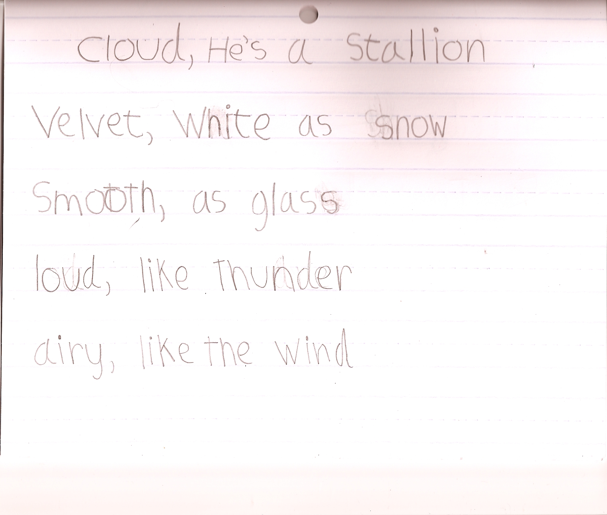 Because she is now getting through her spelling words much quicker, I am able to have her do more of her extra assignments that require great writing skills. Poems is what we've been doing lately. I've scanned one in because I was impressed with both her handwriting and her choice of words. She had a framework to work off of and I helped her sometimes find the right wording, but really a lot of Elise is in this poem. Cloud, by the way, is a real wild mustang that we have watched a PBS Nature series on.