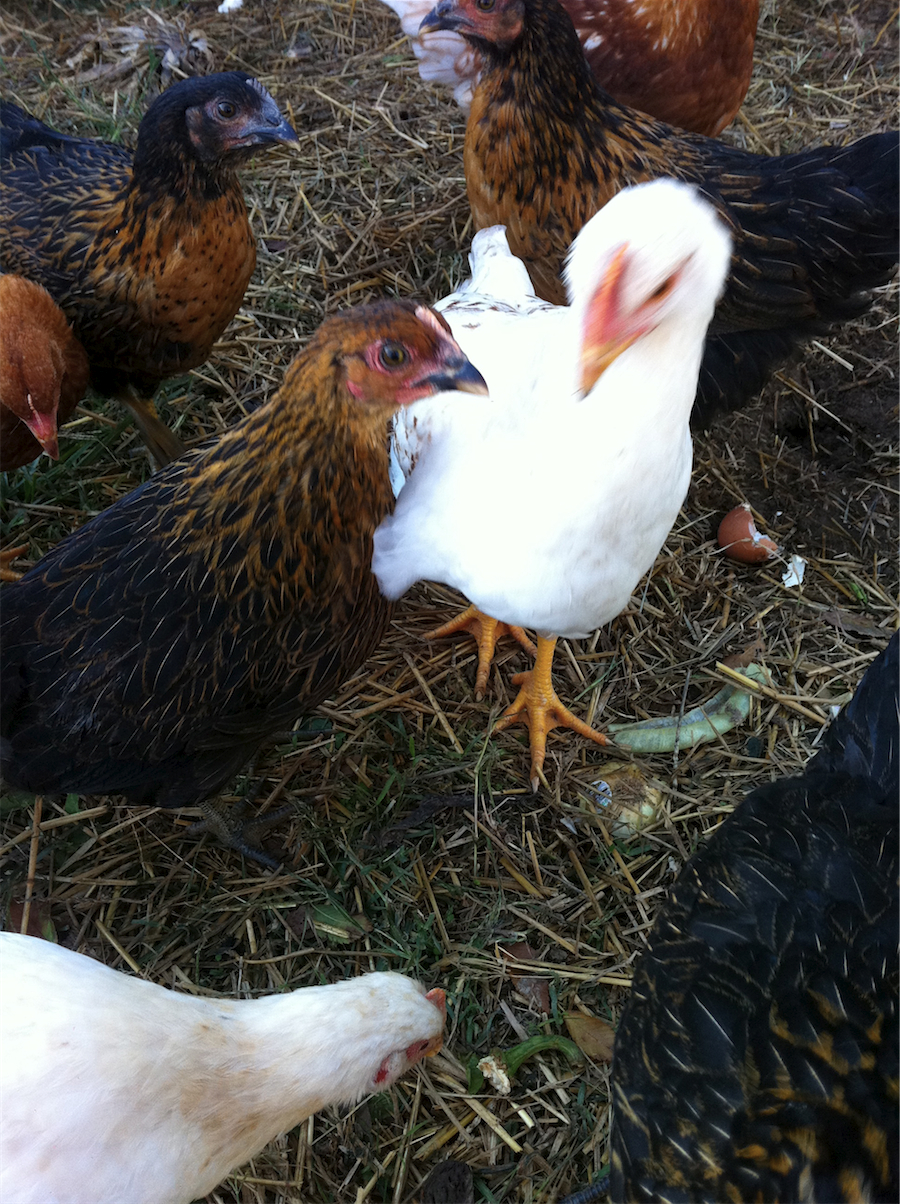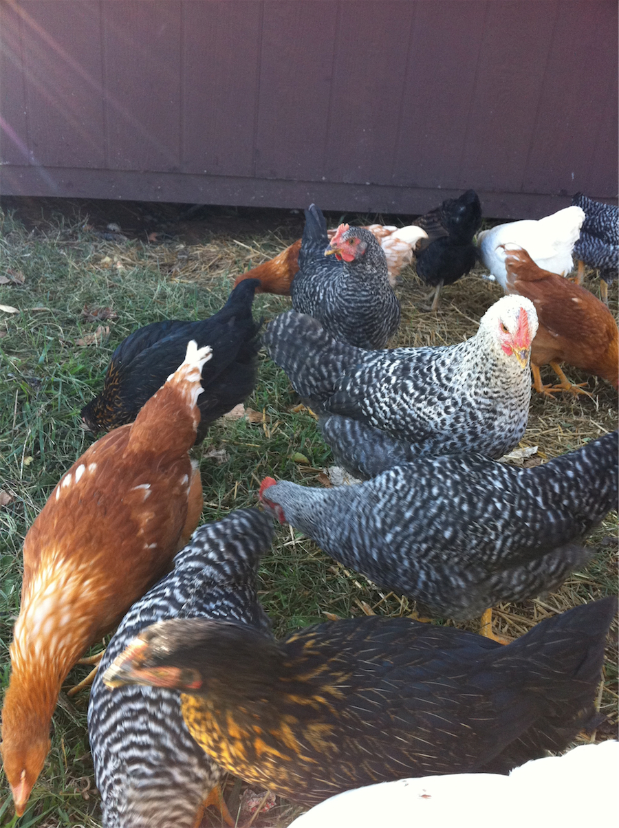 I realized the other day that I hadn't shared any pictures of what has been happening with our animals here. Well, remember all those fuzzy little chicks that arrived back in August? Well, here they are now as 9 week old slim and sleek adolescent chickens. Quite a change right? They are really fun to watch, and come running every time I step outside, just in case I might be bringing kitchen scraps or scratch grains for them. We've taken them off regular commercial feed, letting them search for bugs, greens and other edibles in our yard. Once or twice a day I also give them all natural scratch grains, partly just to make sure they know that there are reasons to stay up around the house. They completely demolish my compost pile every time I add anything to it, but hey, instead of getting compost, I'm recycling my kitchen food scraps into eggs and meat. They have very effectively ridded our yard of all insect pests and have started ranging a little farther from the house to find goodies to eat. Pretty much the only time they get into trouble is when they venture into the neighbor's pasture to get what I can only guess is winter wheat he put down about a week ago. I'm cringing at the thought that he might have whole patches missing when it starts to come up. Sometime in January we'll set aside a day to put away the roosters in the freezer. It will be hard to kill such pretty and friendly birds, but I hope it will be a learning experience for our kids to see a little more of where our food comes from. In case you are wondering, the red and white ones are the red star hens. The black and red ones are the black star hens. The black and white ones are black star roosters and the mostly white ones are the red star roosters. We've been pleasantly surprised at the variation between each one. There are several that stand out enough to be recognized and therefore have been rewarded with names.