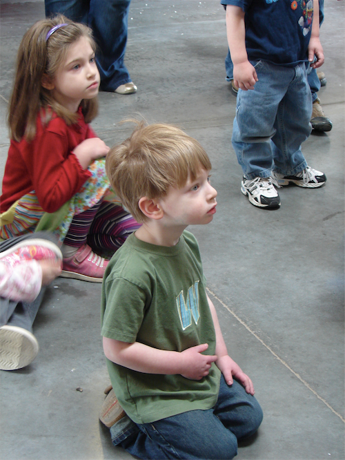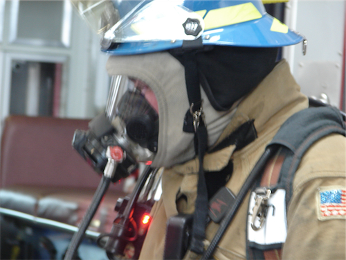 The paramedic was finally able to grab everyone's attention when he showed them how he would get ready for a fire. As he pulled on his protective clothing, all the way up to his air mask and helmet, the kids all watched speechless. He then explained to the kids that if they saw someone dressed like that when they needed help in a fire, not to be scared, but to come to them. After seeing what they look like, I can see why many kids would be scared to death, thinking some weird monster was coming after them out of the smoke and flames. He then demonstrated the alarm that goes off if a firefighter stays still too long to let his team-mates know he needs help. This made an impression on Elise, who asked several questions about it later.