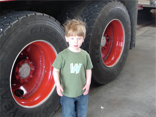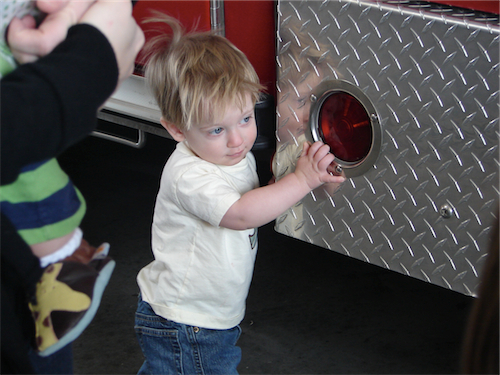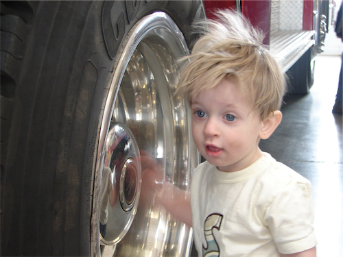 Seth perked up at this point too. He'd been looking pretty tired and was content to let me carry him around. But once everyone started climbing and touching the trucks, he decided he needed to be included as well. He climbed through the ladder truck just like the other kids and then checked out the huge tires.